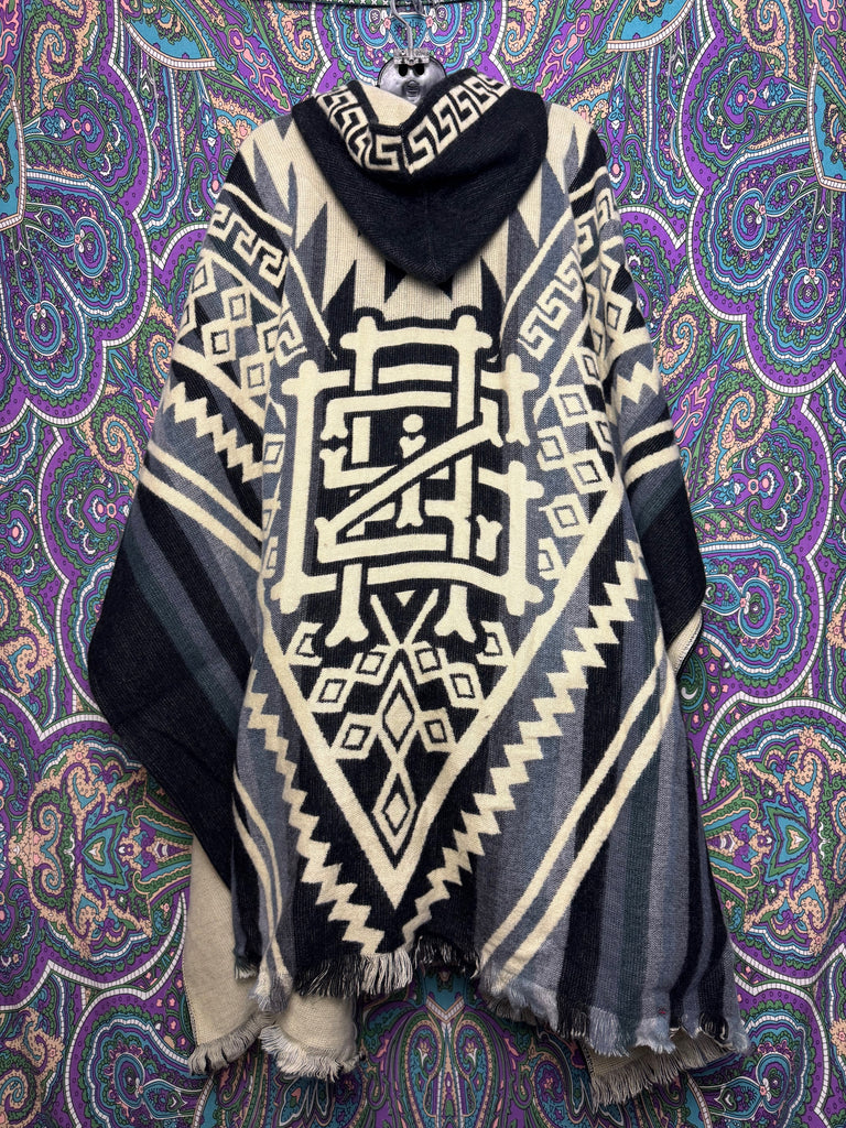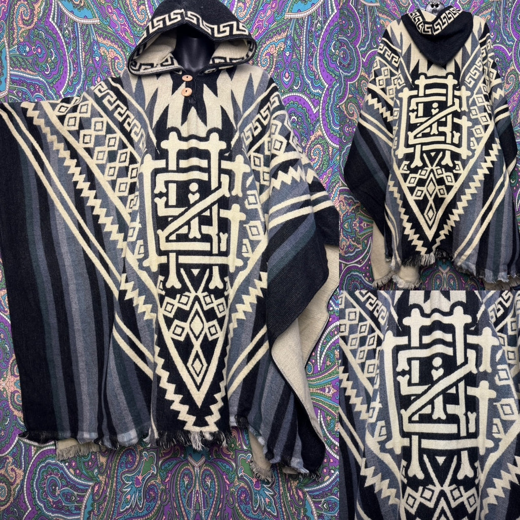 Ponchos measure 50" across and 40" length. Alpaca wool blend keeps these warm and breathable. Nice over sized hood and wooden buttons for closure. Easy to roll and pack in a backpack or bag. One size fits all